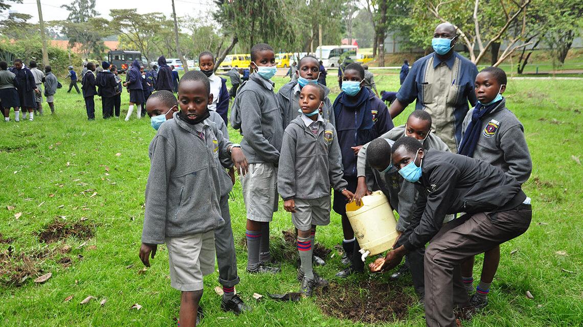 KNEC’s team led by Mr. Wesley Kirui (Secretary, Occupational Safety and Health) prepares the teachers and pupils of St. George’s Primary School in Nairobi County to a tree planting exercise on June 25, 2021.